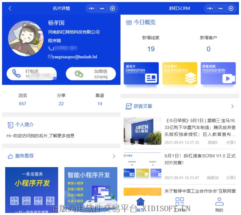 本软件主要包括线索管理、客户管理、客户运营、企业管理、组织架构、员工管理、职务管理、权限管理、商城系统、菜单管理、小程序菜单管理、文件夹、营销话术、朋友圈素材、获客文章、获客视频、智能名片等功能模块。本软件从架构上满足企业官网、SCRM的需求,支持扩展为企业官网+SCRM+微信小程序。
