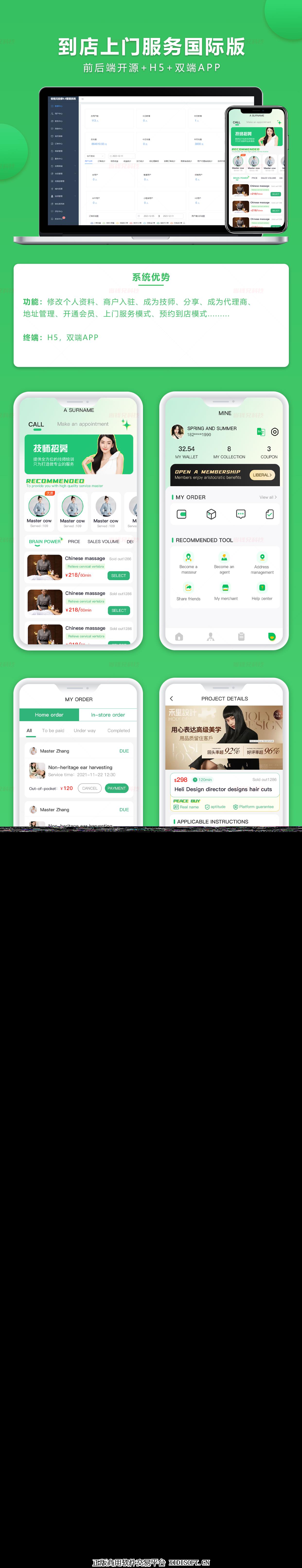 用户端:修改个人资料、商户入驻、成为技师、分享、成为代理商、地址管理、开通会员、上门服务模式、预约到店模式