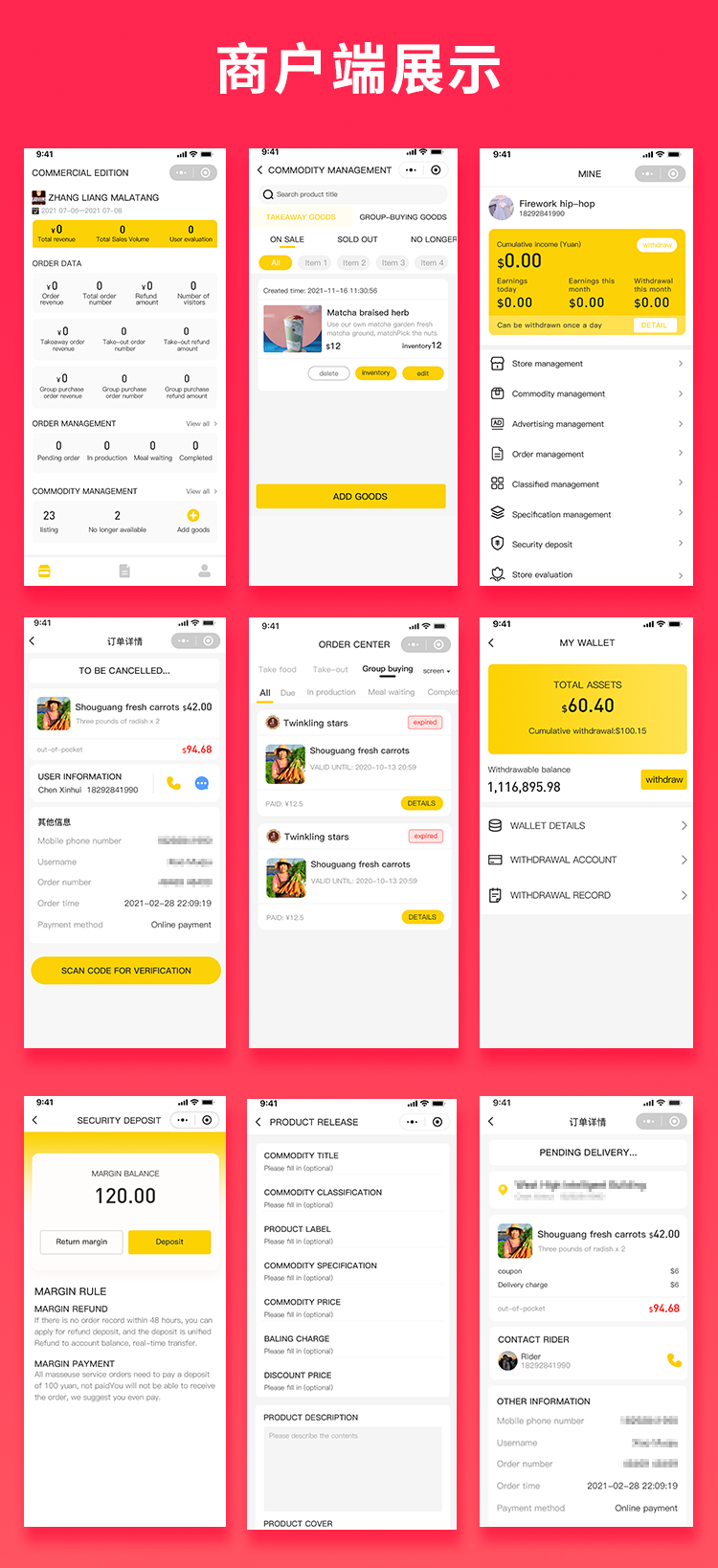 新增登录,门店账户资金,收益统计,商家信息,商家订单,订单列表,订单操作,订单详情,订单筛选,店铺中心,商品列表,商品选择,商品筛选,商品操作,收益统计,联系客服,商品管理,商品分类,数据统计,商品规格,商家入驻、团购商品