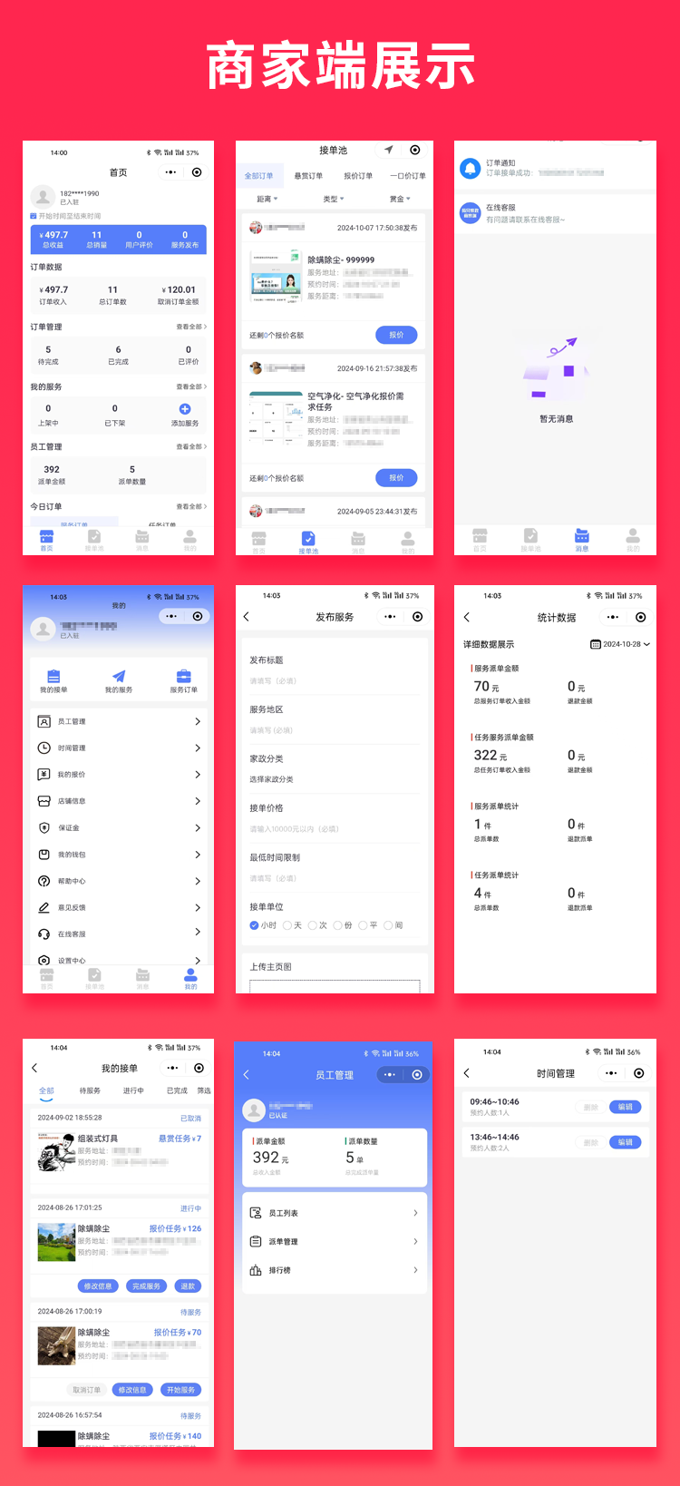支持一口价,报价,悬赏,服务发布,多商户入驻,师傅入驻,员工管理,需求发布,到位同款,分销推广,优惠券活动,在线聊天,师傅列表